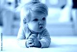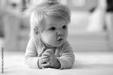 Little baby girl with beautiful blonde hair is lying on a blanket in the living room