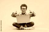 Cute happy smiling African American schoolboy in casual outfit and trendy eyeglasses posing sitting on bright colored yellow background with his laptop and giving thumbs up gesture with both hands