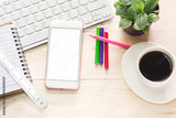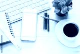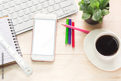 Office workspace with keyboard notepad coffee of cup and smartphone on wood table.