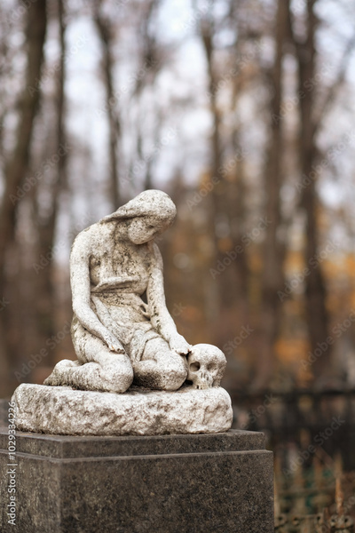 ancient tombstone of woman with skull on old cemetery in autumn time. vintage style. symbol of religion, faith in God, mourn, memory. all saints day. Design for condolences, mourning card or obituary
