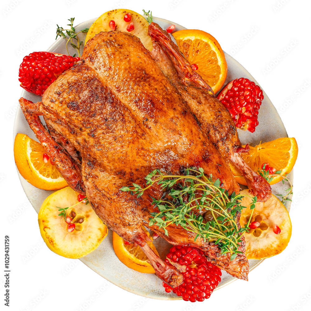 Homemade baked duck. Crispy whole roast duck with rosemary and oranges on isolated on white background. Thanksgiving or Christmas dinner