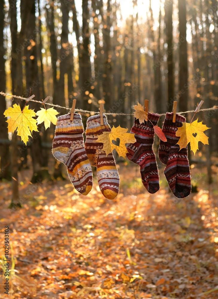 Autumn nature background. autumnal leaves and knitted socks hanging on rope in forest, natural sunny backdrop. symbol of fall season. copy space