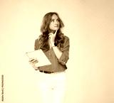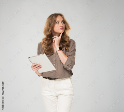 woman with tablet thoughtfully looks away.beautiful woman on white background with tablet decides invents chooses something