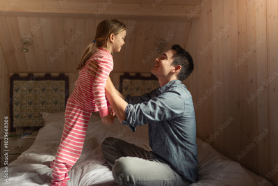 Happy father holding his daughter playing at home in the bedroom. Family fun bonding, good parenting