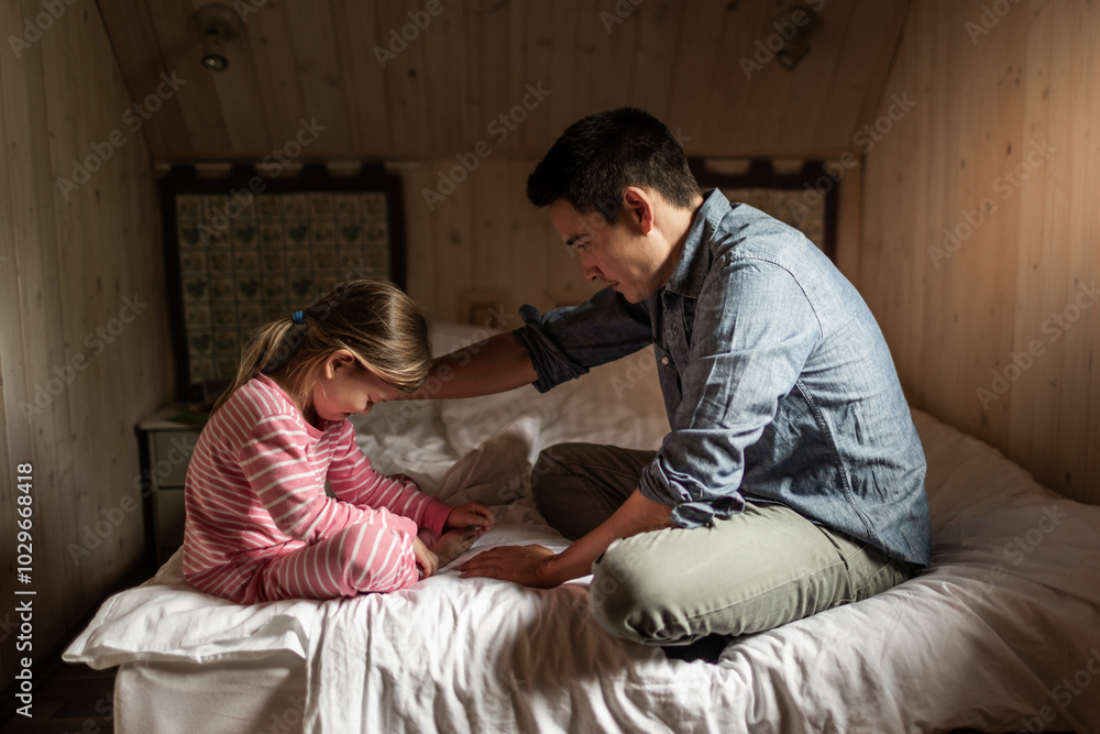 Parent comforting helping sad emotional child at home, concept of bullying, stress, disappointment, sadness family problems