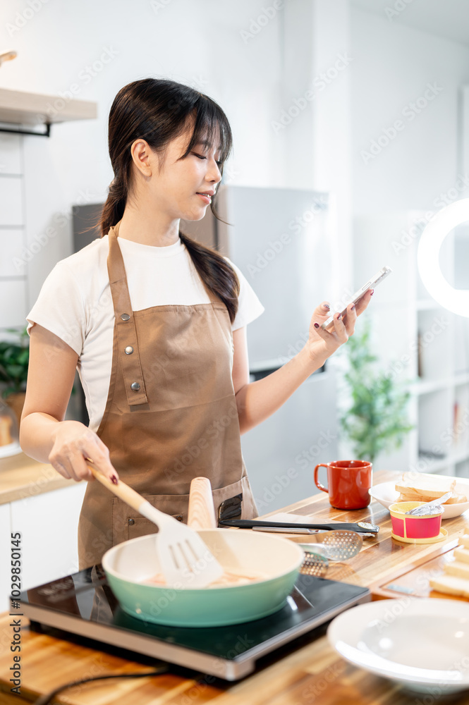 A happy Asian woman is holding her smartphone while cooking in the kitchen.