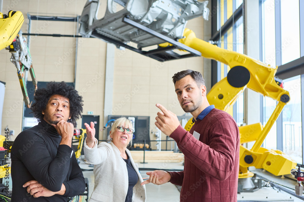 Diverse team discussing robotics and automation processes in a modern industrial setting