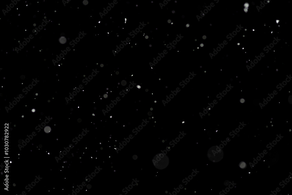 Bokeh effect of snowfall and lights. Abstract blurred background with snowflake in the night sky, White spots and dots in the dark. Snowy stormy weather, falling snow