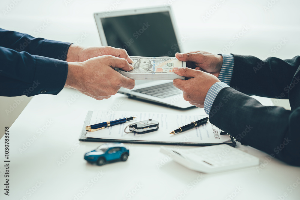 The car dealer and the customer enter into a contract with an application form that receives financial approval from the bank for the loan. Close-up pictures
