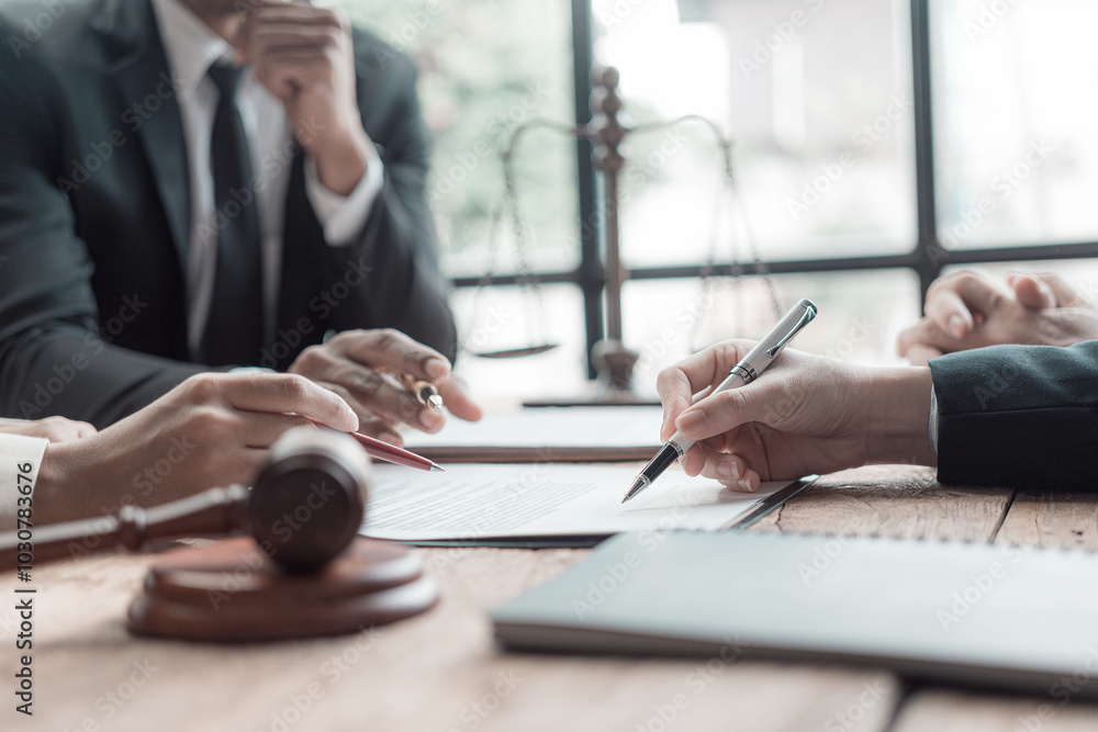 Male lawyer working with contract documents and wooden hammer on table in courtroom justice and law Judge in suit or lawyer working with documents Law, advice, close-up pictures