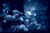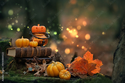 witch cauldron with decorative halloween pumpkins and spell books in autumnal forest, abstract nature backdrop. Halloween background. Magic, witchcraft, mystery fairy tale. Fall season decor