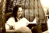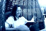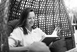 Young woman reading a book relaxing in a comfy lounge chair in a green nature setting enjoying weekend holiday