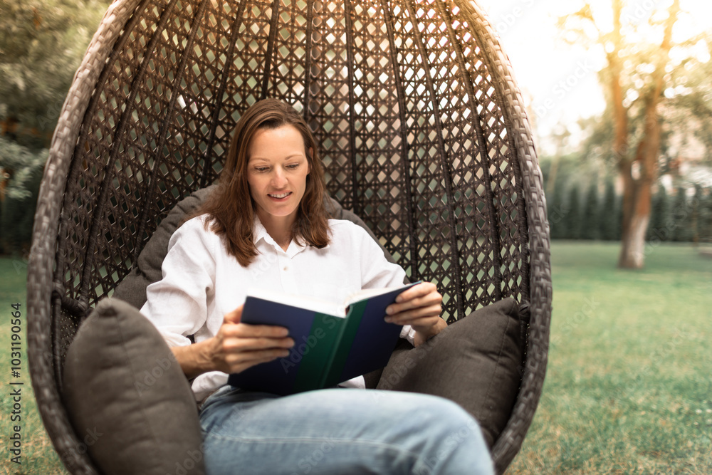 Young woman reading a book relaxing in a comfy lounge chair in a green nature setting enjoying weekend holiday