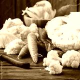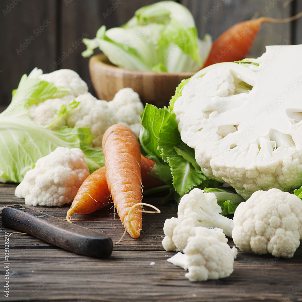 Fresh raw cauliflower and carrot on the wooden table