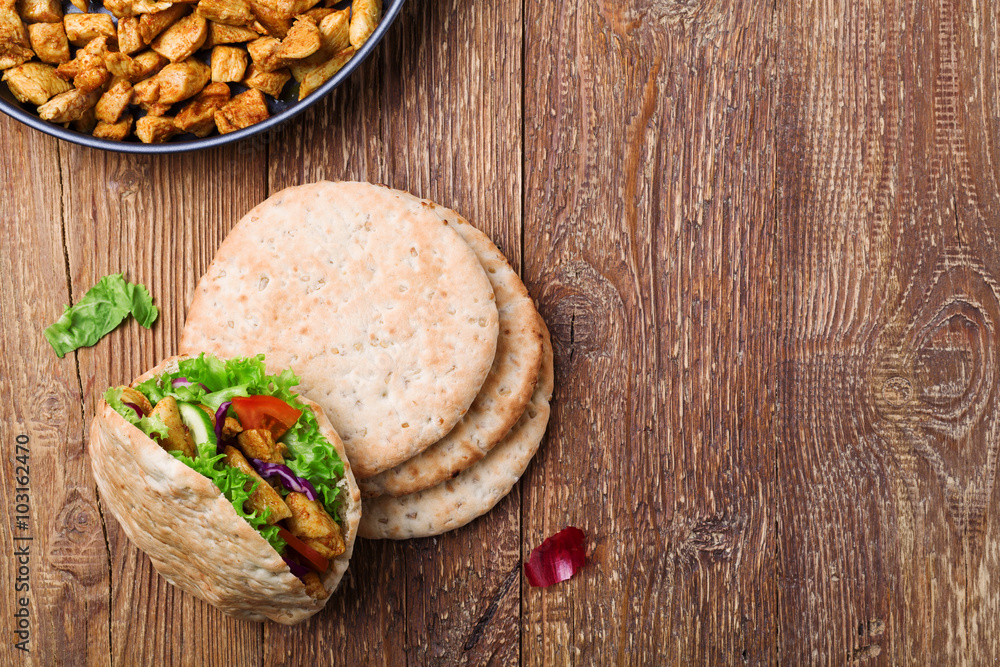 Pita salad with roasted chicken and vegetables, served with a de