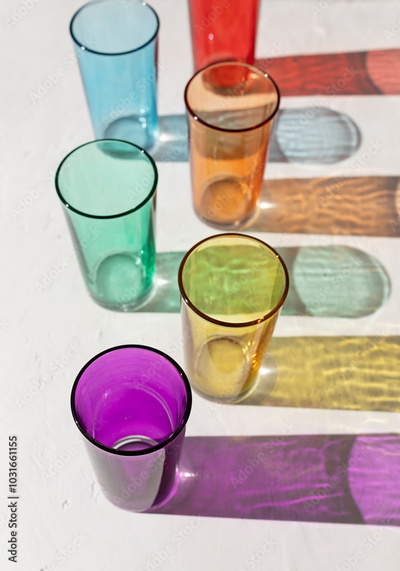 Transparent colorful glasses with sun shadows on harsh light on the white concrete background