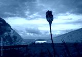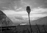 Red Hot Poker Lily flower at sunset. Cape Brett hut in the distance. Cape Brett Walkway. Bay of Islands.
