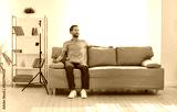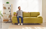 Young male patient getting an intravenous vitamin treatment at home. Happy, relaxed man with an IV drip needle in his vein sitting on a comfortable couch in the living room. Vitamin therapy concept