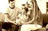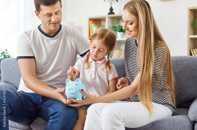 Happy young family sitting on couch together with parents holding blue piggy bank in their hands and little preteen daughter putting coins in moneybox. Planning family budget, economy and saving up.