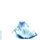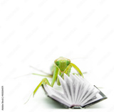 Green mantis on an old book, close up, selective focus. Mantodea