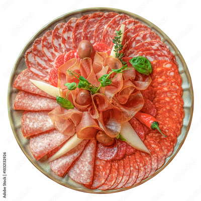 Meat antipasto platter salami, sliced ham, sausage, prosciutto isolated on white background. Top view