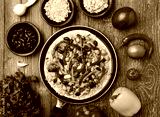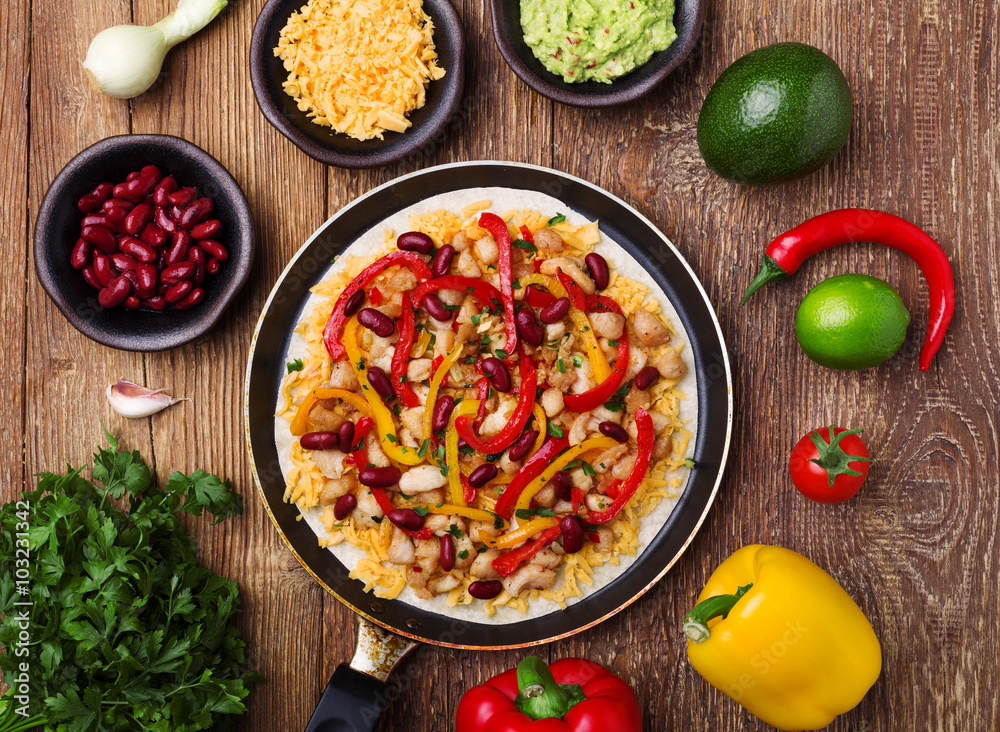 Quesadilla with chicken, served with guacamole or salsa sauce.