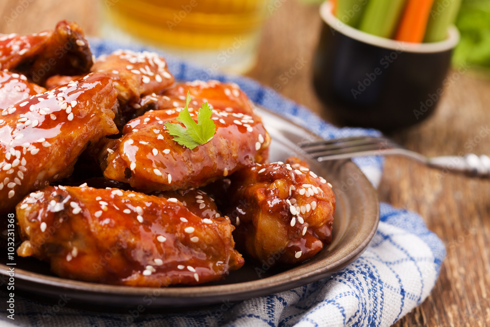 Baked chicken wings in honey sauce sprinkled with sesame seeds.