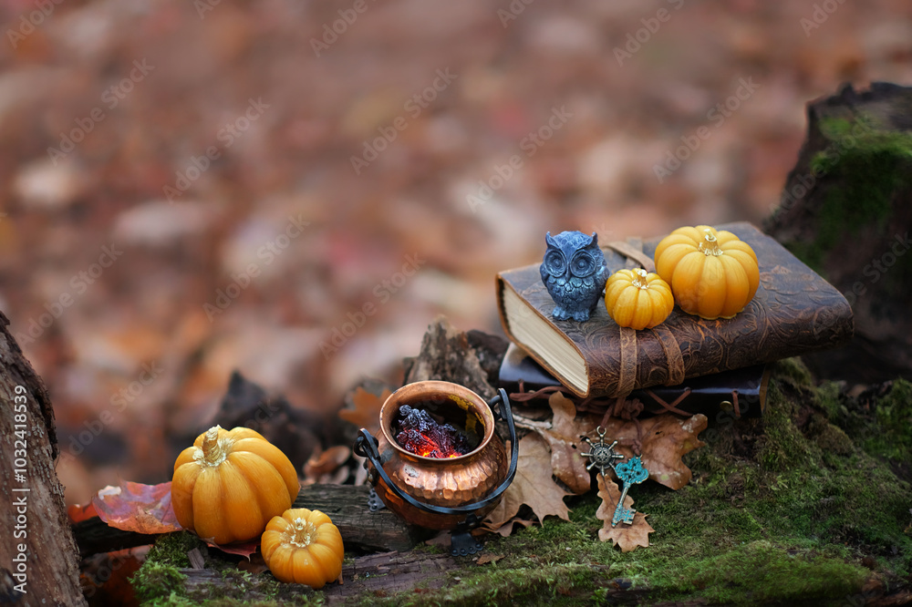decorative pumpkins, owl figurine, books and magic cauldron in autumn forest, abstract background. mystery fairy tale scene. samhain sabbat, Halloween holiday. Witchcraft, esoteric spiritual ritual