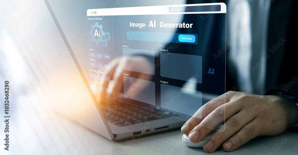 Artificial Intelligence Image Content Generator.AI image creation service technology.Person using AI software to generate images with futuristic platform user interface. Image AI generator concept