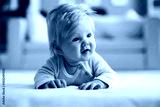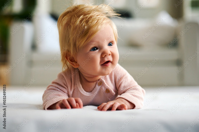 Little baby girl with smile on his face and beautiful blonde hair is lying on a blanket in the living room