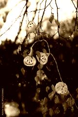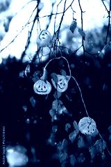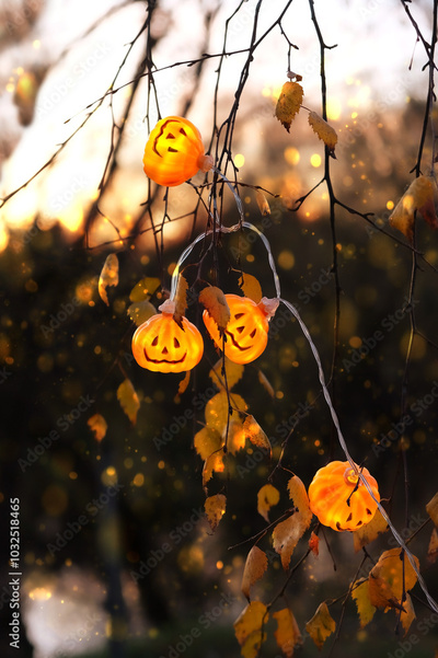 Glowing jack-o' lantern garland in fairy tale forest, abstract dark nature background. mysterious halloween night. symbol of Halloween, Samhain holidays. autumn season. template for design