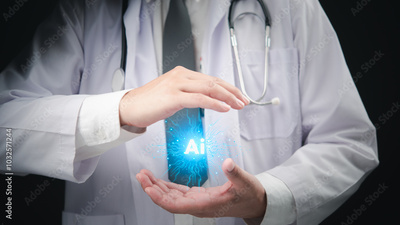 Doctor hands surrounding a glowing AI icon, symbolizing artificial intelligence in healthcare.