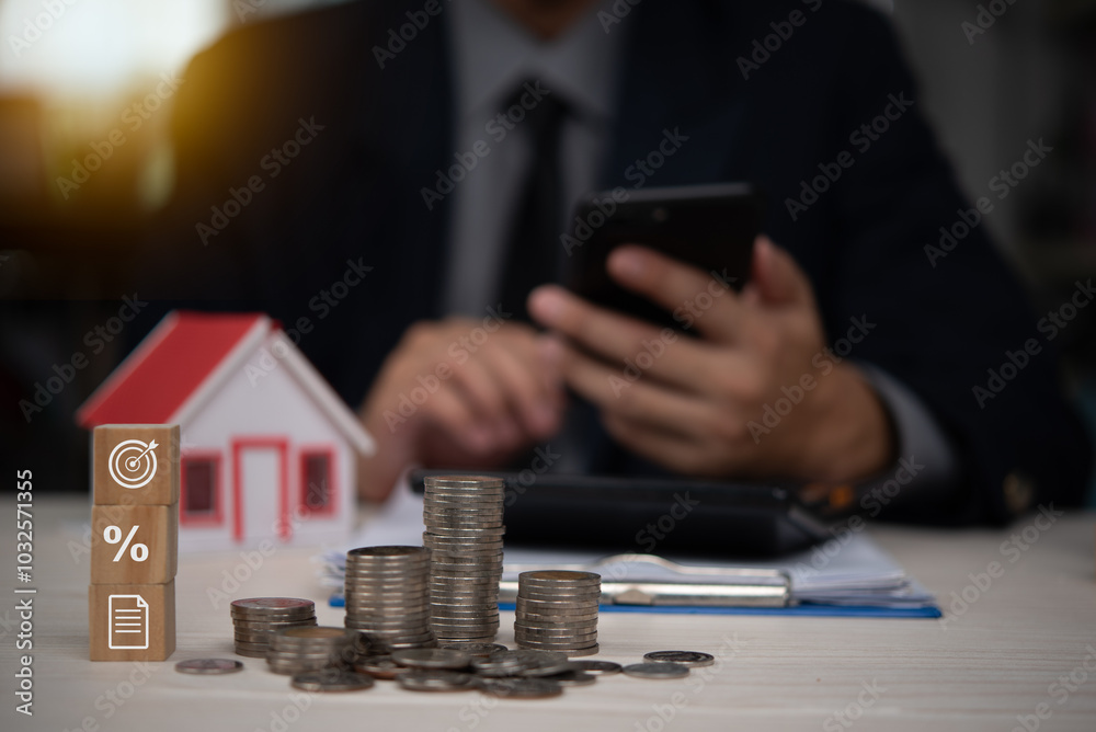 Businessman working with a mobile phone, next to stacked coins and a house model, representing real estate investment.