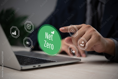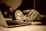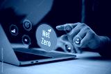 Businessman hand selecting a glowing net zero icon next to environmental symbols.