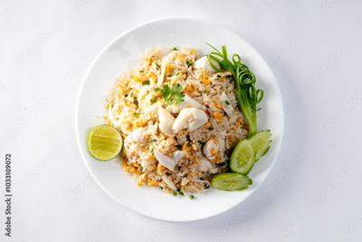 Crab fried rice with cucumber, spring onion and lemon on a white plate