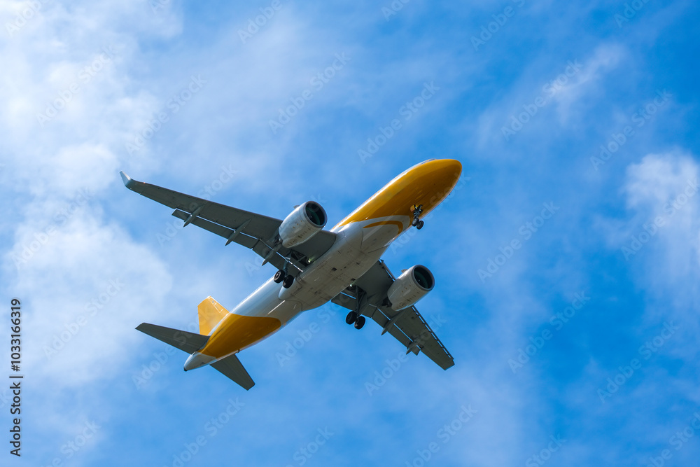 Airplane flying in the sky preparing to land at the airport. Air travel and traveling abroad