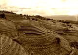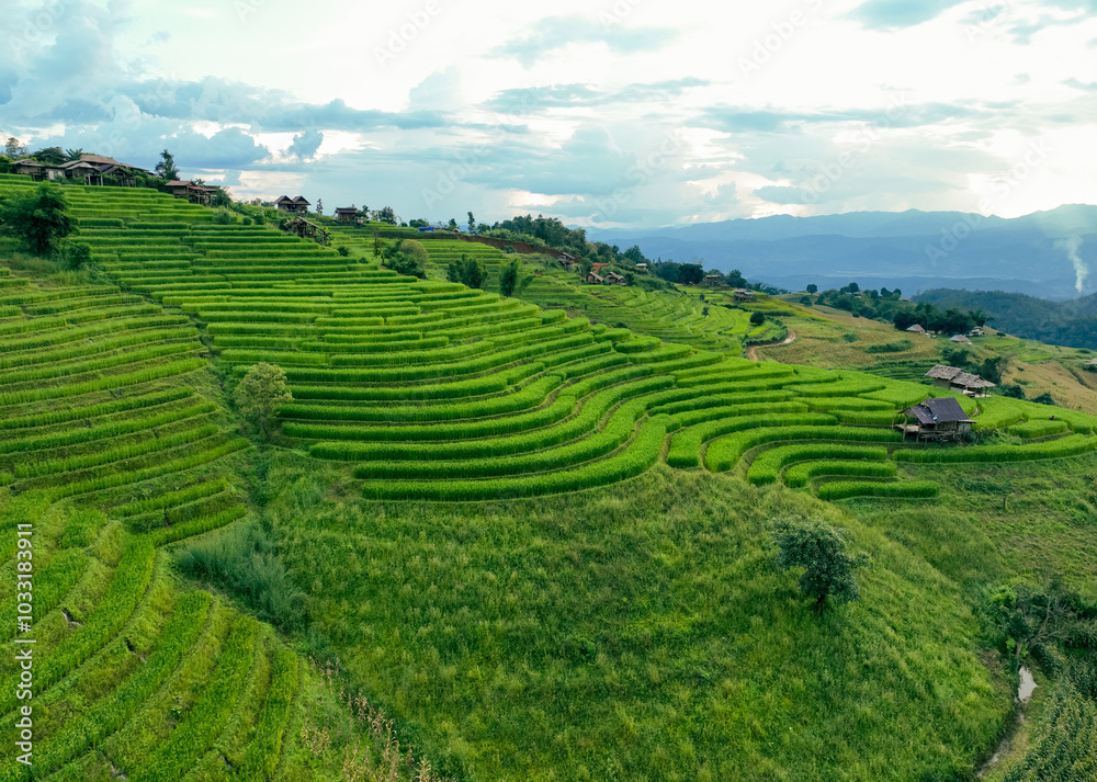 Landscape of green rice terraces and traditional huts in a village near Chiangmai, Thailand. Travel destinations. Beauty of terraced rice fields. Rural life and traditional farming practices in Asia.