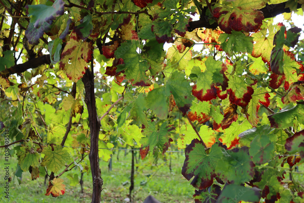 Red and yellow Vine leaves in the Pinot vineyard on autumn season. Vitis vinifera cultivation