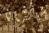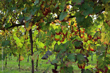 Red and yellow Vine leaves in the Pinot vineyard on autumn season. Vitis vinifera cultivation