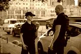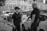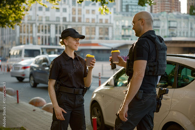 Diverse young two patrol police officers drinking coffee enjoying break rest