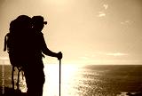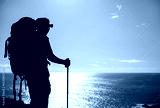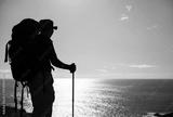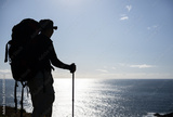 Back view of a backpacker in silhouette. Cape Brett Walkway. Bay of Islands.