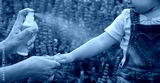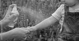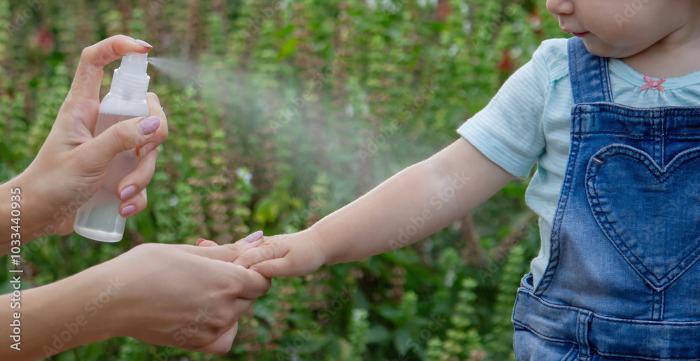 mother applies an aerosol insect spray to the child's body. Selective focus