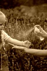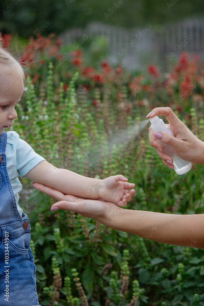 mother applies an aerosol insect spray to the child's body. Selective focus