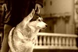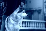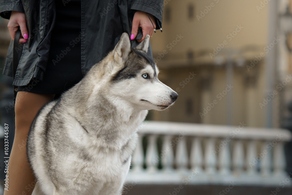 A Siberian Husky stands beside its owner on a city street, surrounded by historic buildings. The dog composed stance reflects its connection with the urban environment.