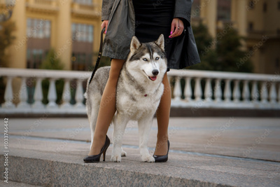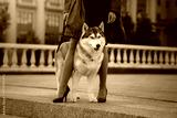 A Siberian Husky sits beside its owner on a city street, both surrounded by classical architecture. The dog calm demeanor complements the tranquil city atmosphere.