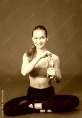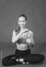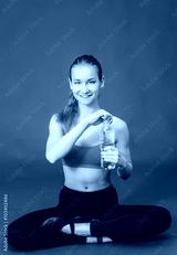 young woman sitting in lotus position with bottle of water on a blue background. Fitness, workout, exercise, drink