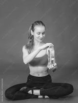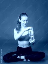 young woman sitting in lotus position with bottle of water on a blue background. Fitness, workout, exercise, drink