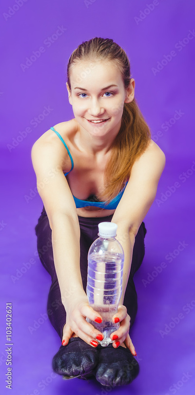 young woman doing stretching. with a bottle of water on a blue background. Fitness, workout, exercise