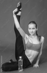 young woman doing stretching. with a bottle of water on a blue background. Fitness, workout, exercise
