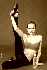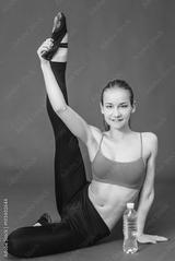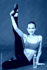 young woman doing stretching. with a bottle of water on a blue background. Fitness, workout, exercise
